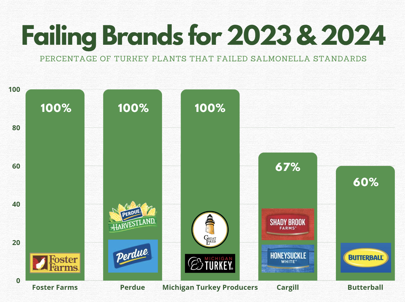 For the last two years, 100% of slaughter and processing plants owned by Foster Farms, Perdue, and Michigan Turkey Producers failed the USDA’s salmonella safety standards. Sixty percent of Butterball’s plants and 67% of Cargill’s plants failed the standard. (Note: Perdue also sells under the Harvestland brand, Michigan Turkey Producers sells under Great Lakes, and Cargill sells under Honeysuckle White and Shady Brook Farms).