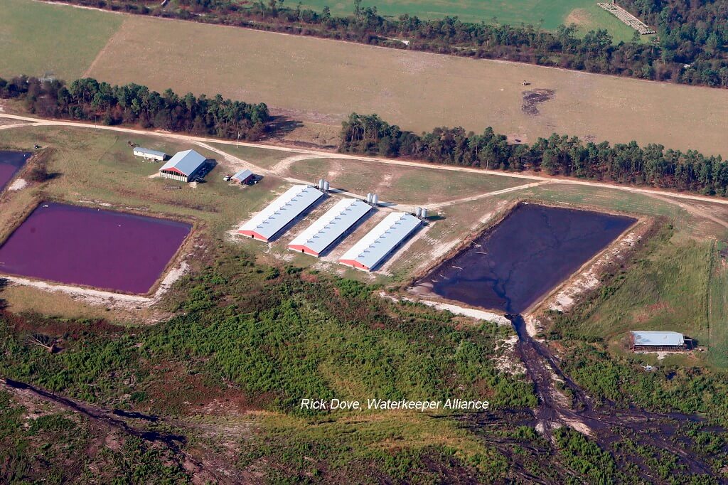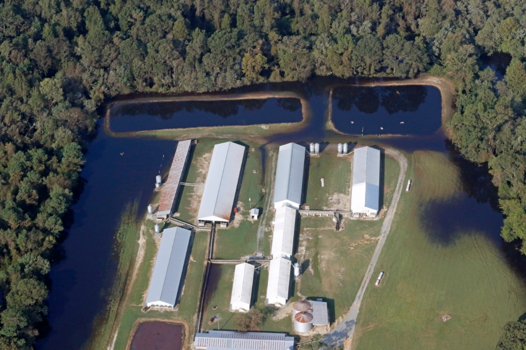 We’ve seen a lot of these facilities where…the industry calls it “overtopping.” That kind of sounds like putting whipped cream on a dessert. “Submersion” is what’s happening. These lagoons go underwater, and when the floodwaters recede, they take the contents with them. We’ve got videos of hogs floating down the river. We’ve got dead chickens floating around in their own feces. Some journalists actually kayaked inside of some the poultry barns and filmed the dead chickens floating in the barns in the muck. It’s a terrible sight.