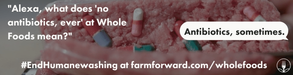 Apparently Whole Foods’ “no antibiotics, ever” marketing really means “antibiotics, sometimes.” Farm Forward recently exposed Whole Foods’ humanewashing after we uncovered drugs in the Amazon-owned retailer’s meat. Now, as Amazon’s annual shareholder meeting kicks off, the cities of Austin and Seattle have decided not to run Farm Forward’s new humanewashing public service announcement. We believe that the ad’s censorship by the two cities—where Whole Foods and its parent, Amazon, are headquartered—is unconstitutional, on First Amendment grounds.