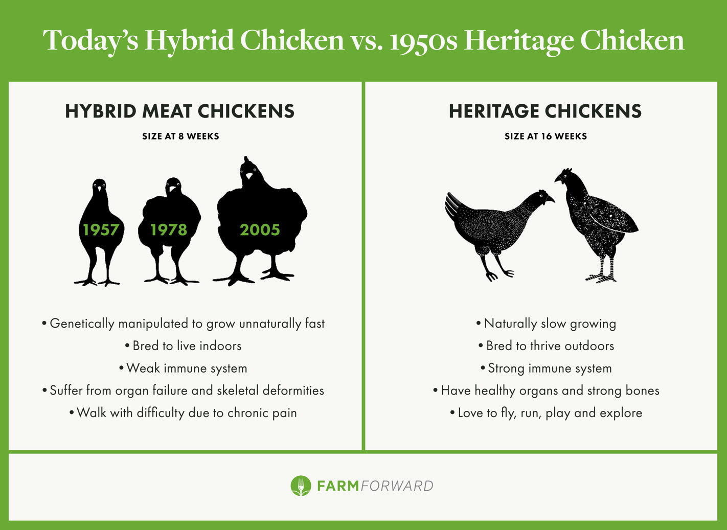 Animal breeding has changed dramatically over the past 60 years. Until as late as the 1960s, most farmers either bred their own animals or purchased animals from a local farmer who did. These animals, especially poultry, were selected for a balance of traits: growth and efficiency, but also immune health and the ability to forage, thrive outdoors, and mother their young. That changed after World War II with the development of hybrid breeding techniques. Unlike traditional breeding, hybrid breeding involves a complex process of combining many different breeds of birds (crossbreeding), which requires producers to maintain multiple specialty “breeder” lines (Hanke, Skinner, and Flore 1974). These lines of inbred animals carry specific genetic mutations, such as the so-called “obese gene” (Lin, Friars, and Moran 1980) that facilitates weight gain, and are not actually the birds consumers eat. Of these different lines, 10 to 20 are then crossbred in pre-determined sequences to produce the eggs that become the “hybrid” Cornish Cross birds eaten by consumers (Reese 2012), known as “broilers,” who have been so genetically modified that they bear little resemblance to chickens raised before 1960.
