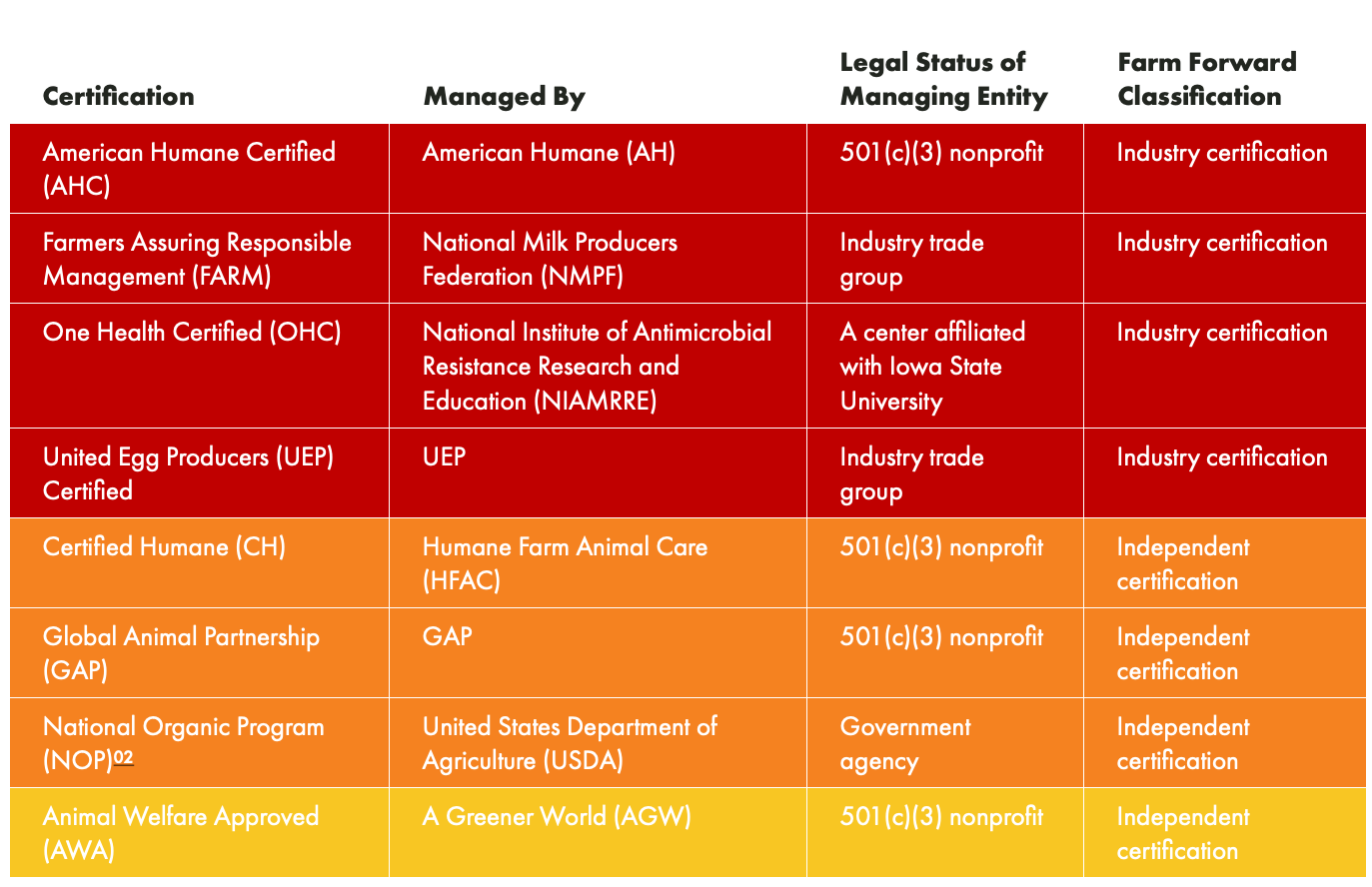 Table 1. Animal welfare certifications in the United States